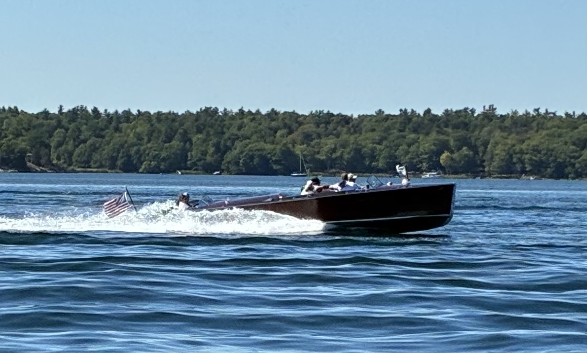 Today’s schedule at the 2025 ACBS Annual Members’ Meeting and Boat Show included no less than 6 hours of on-the-water time for leisurely cruising the spectacular St. Lawrence Seaway and 1,000 Islands environs which stretch north into Canada. With no less than 50 vintage speedsters poised for the excision, Mother Nature offered up clear blue skies, temperatures in the low 70s(f) and these visuals which were culled from over 2,000 clicks.