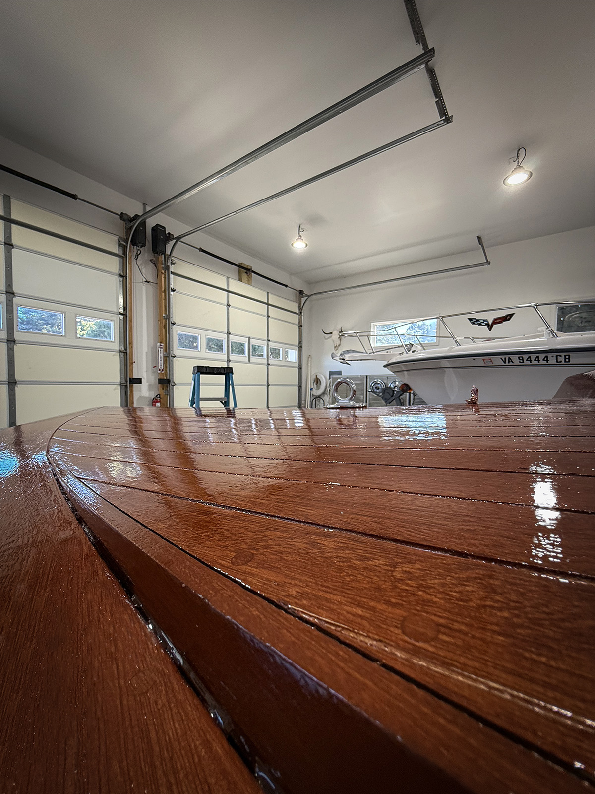 Wayne’s got a fantastic workspace! I love the ceiling height and lighting! B, the boat, is looking really good! I enjoy seeing Mr B as well! He’s looking good too! One thing that you have at HQ is the view out the shop door! That is magical!