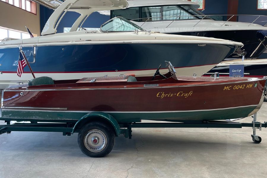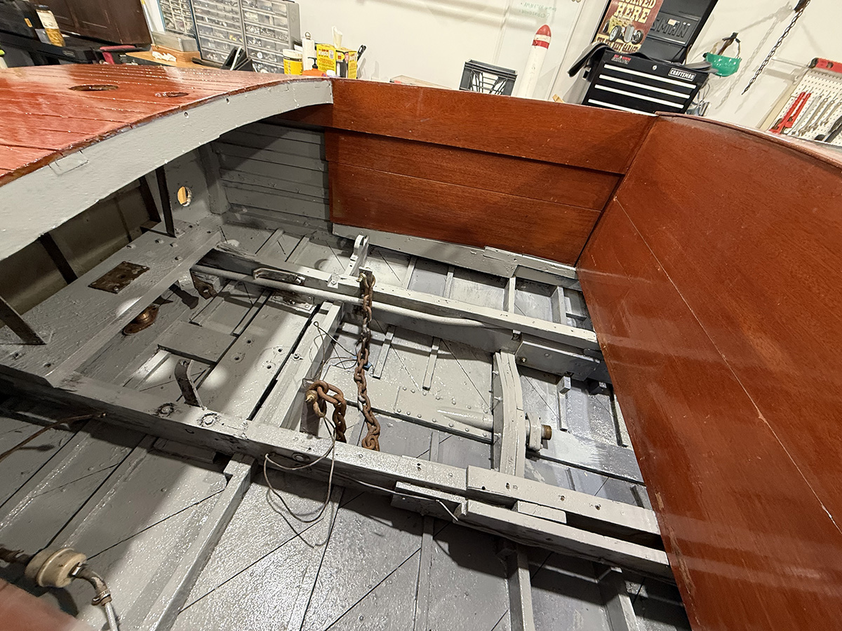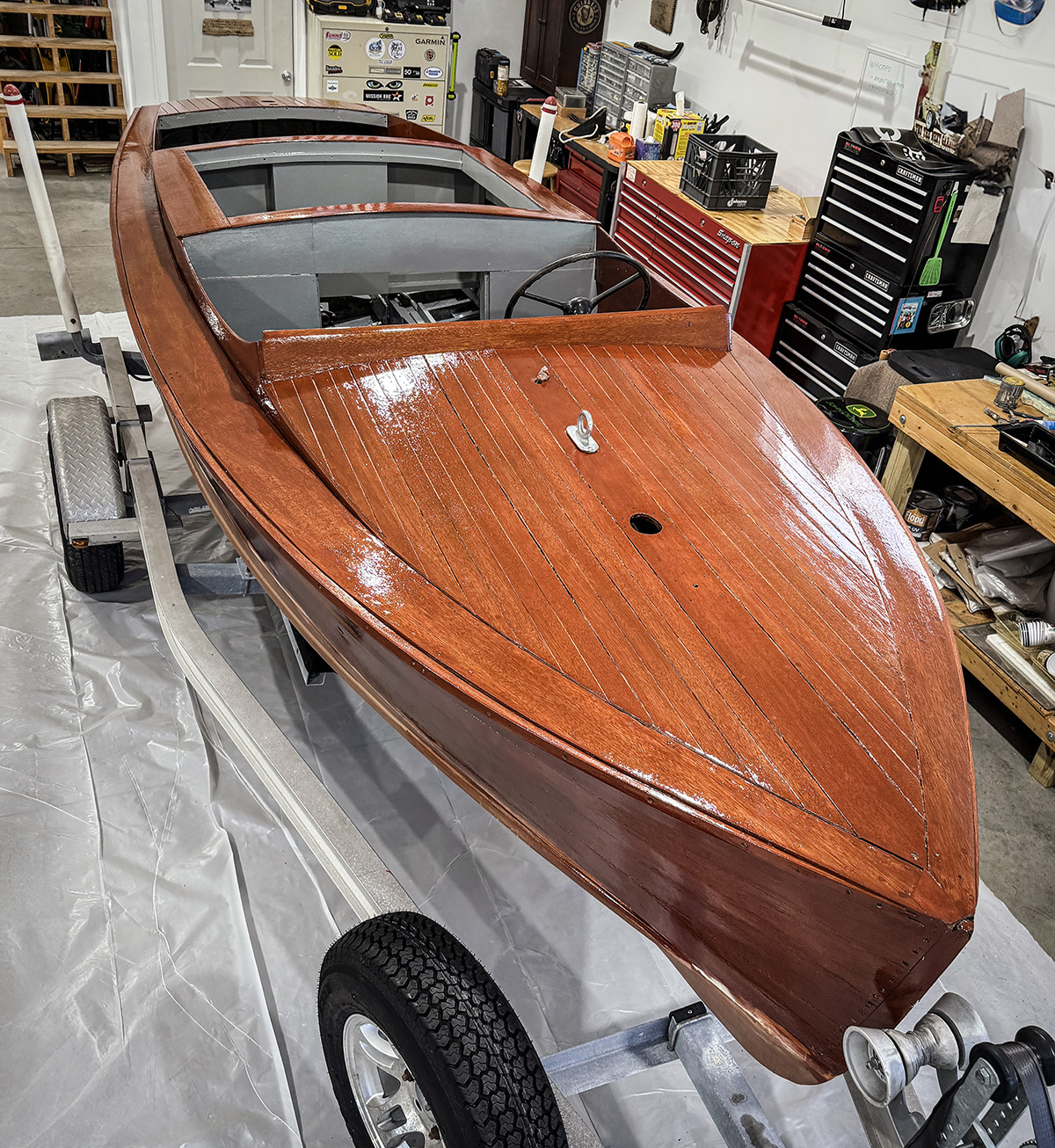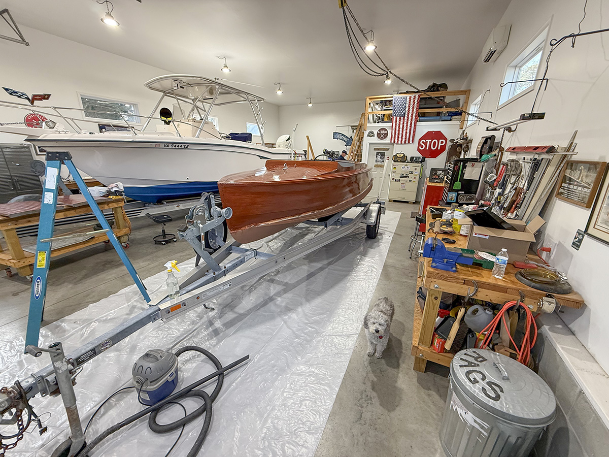 B sitting next to Wayne’s newer, bigger boat reminded me of one of the for sale photos of mine before I bought it. They had it sitting in the display room at Walstrom Marine in Harbor Springs for awhile. What a contrast of old vs new, classic vs modern and the size perspective of these cute little boats.